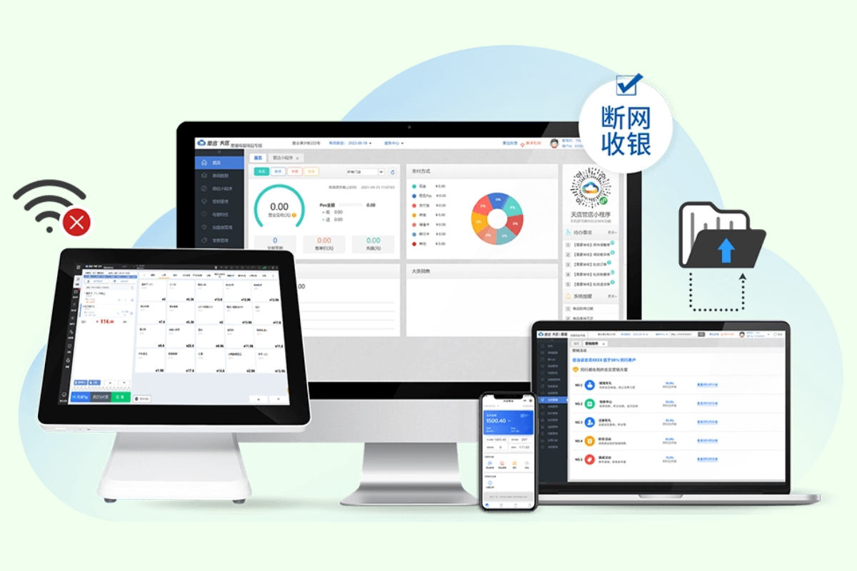 断网状态下仍可正常收银72小时,网络恢复自动上传经营数据,电子秤、客显、钱箱等外接设备参数设定后可通过云端进行备份,支持一键恢复。