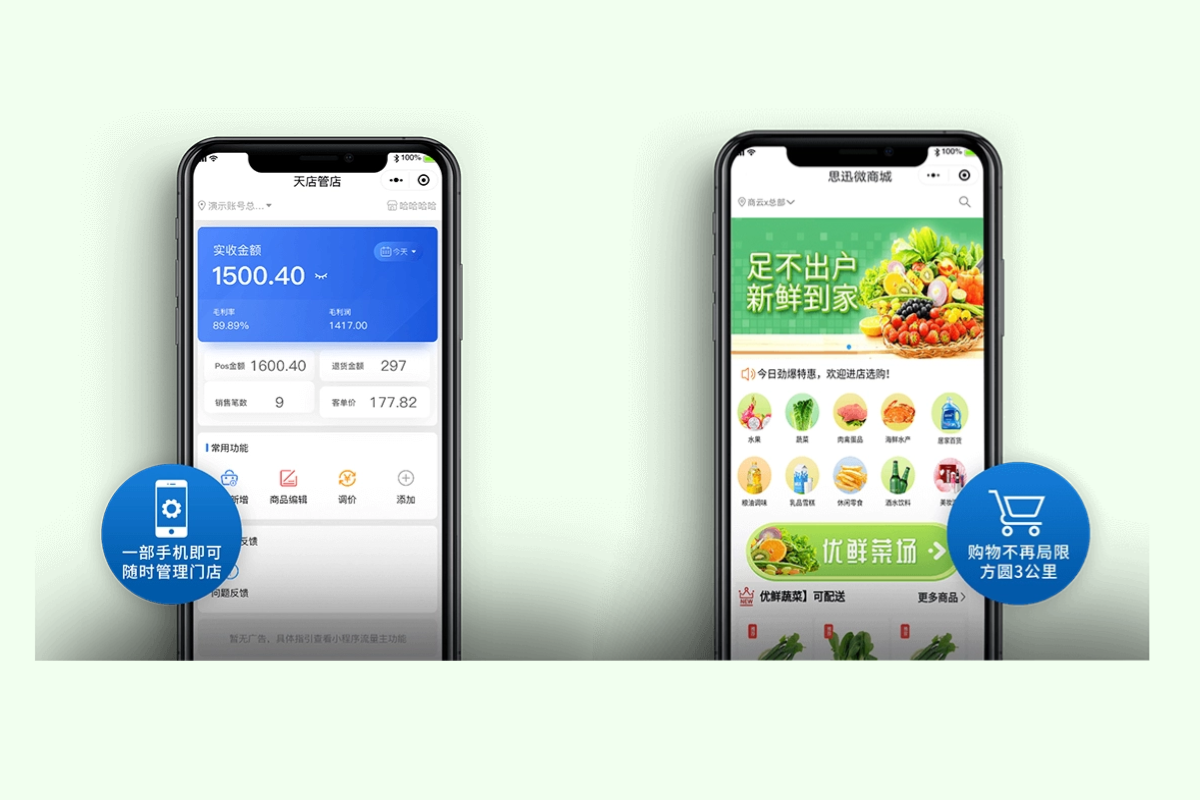 - 线上微商城:开通天店微商店,您的经营区域将不局限在某个小区、某个商圈,再远的顾客都能通过微信到您的线上商城购物,会员数据、商品数据全面打通,线上购物更顺畅。营业区域没了局限,店铺营收却有无限空间