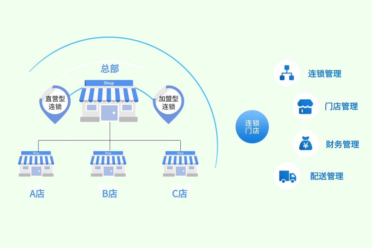 - 对于进行品牌授权的加盟门店,门店有更高的自主经营权限。加盟门店 除销售加盟品牌产品外,拥有门店独立经营的全部管理功能,包括建立商品档案、会员体系、促销方案等