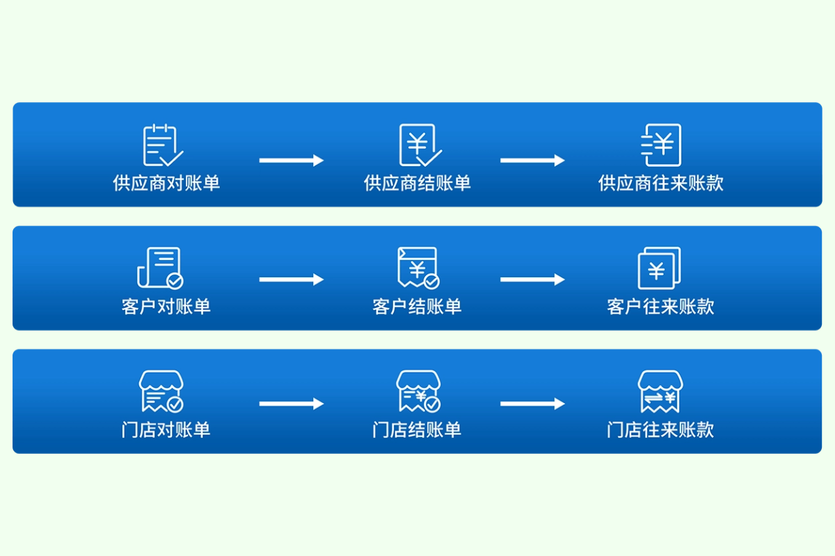- 连锁账务:门店费用、门店账款、门店预收款、门店收款已收款总账、门店对账单、门店结算单
